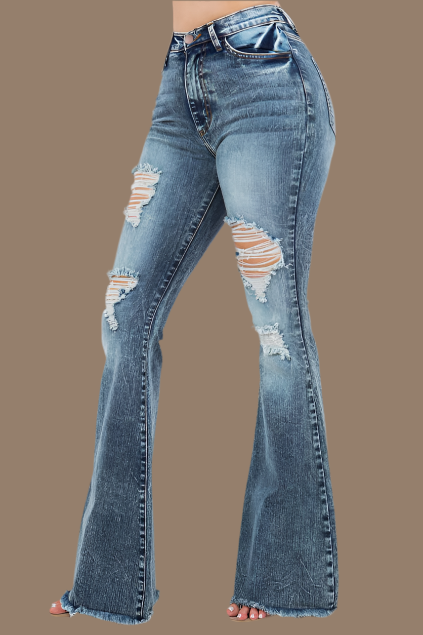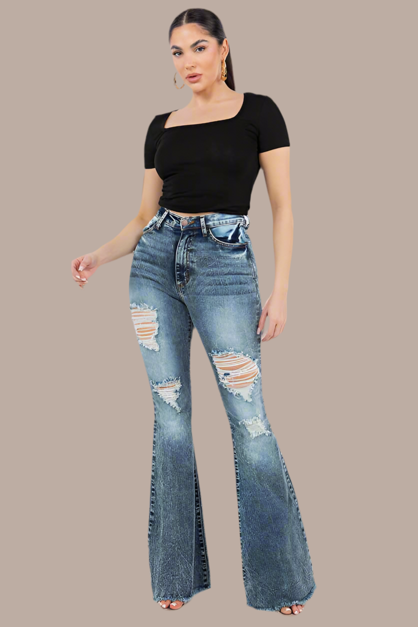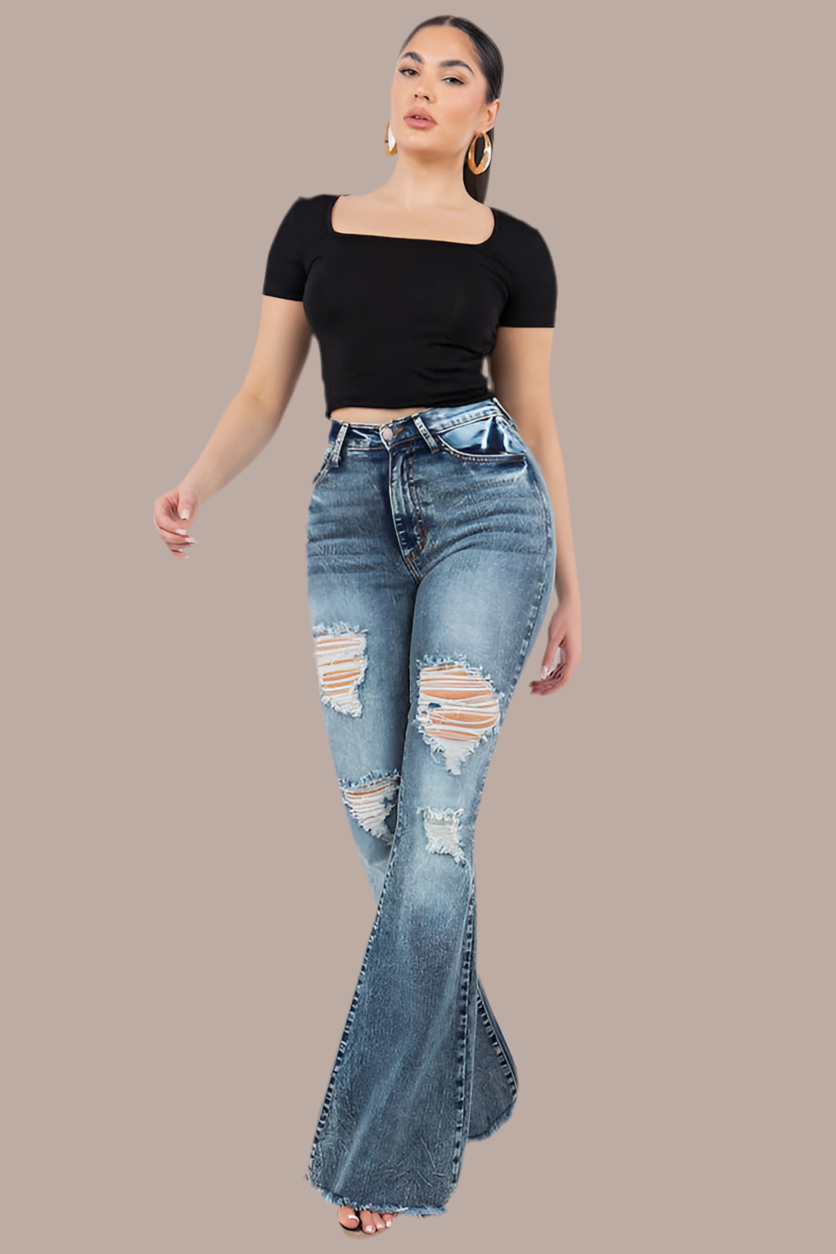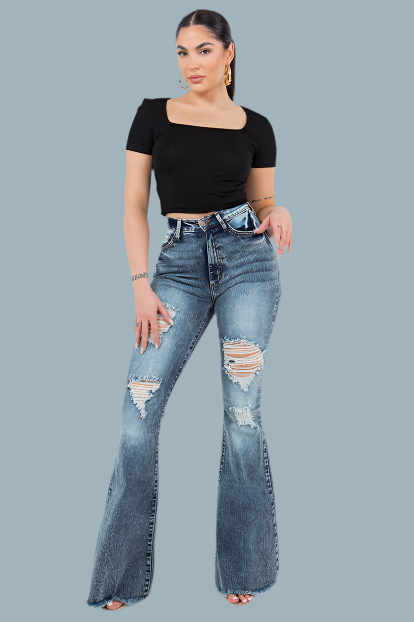 These Bell Bottom Jeans are made from a high-quality soft stretch fabric that offers exceptional comfort and style. With a 34" inseam, frayed hem details, and rip accents, along with front and back pockets, these jeans bring a trendy yet timeless flair to any outfit.