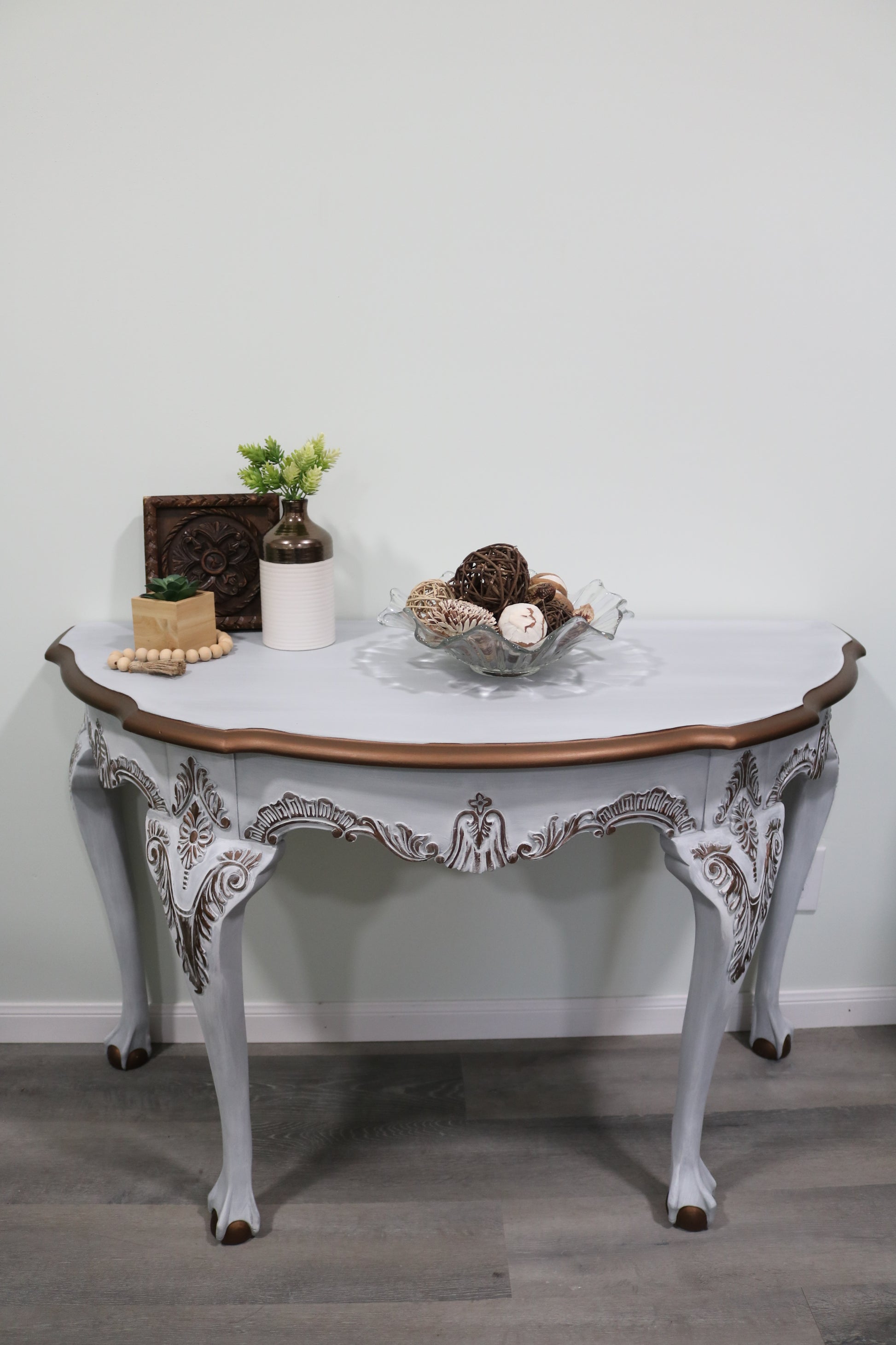 This Chippendale Entryway Table painted Linen Grey and White to give it a luxury look. The patina bronze gives it a very luxury look that will go into your beautiful home. You will not find another like this one of a kind entryway.