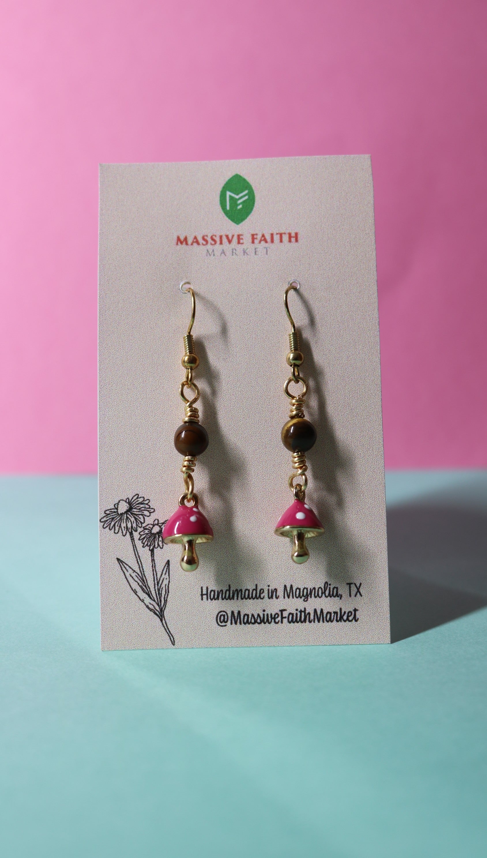 These whimsical earrings combine the grounding energy of Tiger’s Eye with the playful charm of pink enamel mushrooms. Each pair is thoughtfully designed to bring balance, confidence, and a touch of magic to your everyday style.